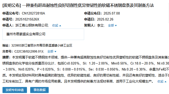 2025年7月8日,浙江青山鋼鐵有限公司聯(lián)合惠州市君豪盛實(shí)業(yè)有限公司成功申請(qǐng)一項(xiàng)名為“一種兼有超高耐蝕性良好切削性優(yōu)異塑韌性的軟磁不銹鋼盤條及其制備方法”專利,申請(qǐng)公布號(hào)為CN120272818A,申請(qǐng)日期為2025年2月26日。